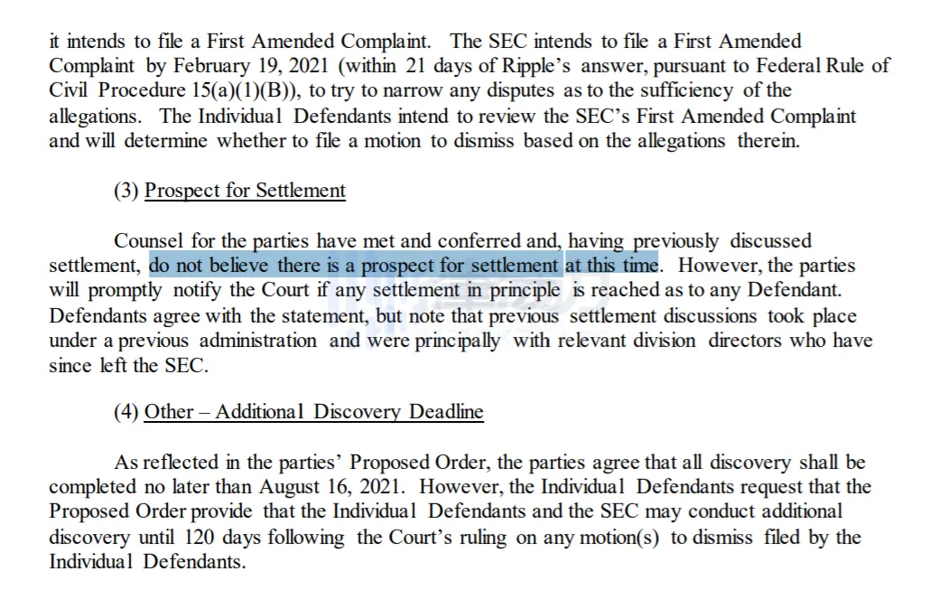 2021 年 2 月 15 日,在共同递交给纽约南区美国地方法院联邦法官 Analisa Torres 的函件中,SEC、Ripple 公司和两位创始人各方都表示「Ripple 涉嫌证券违规行为的预审会议之前和解」的可能性很小。