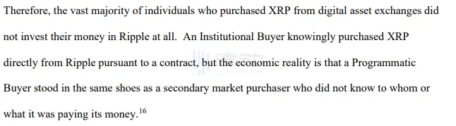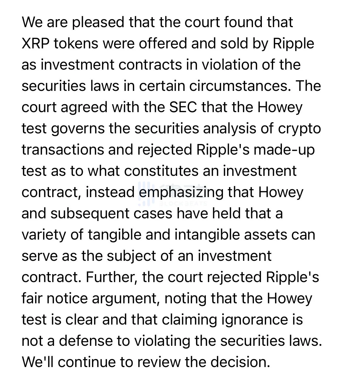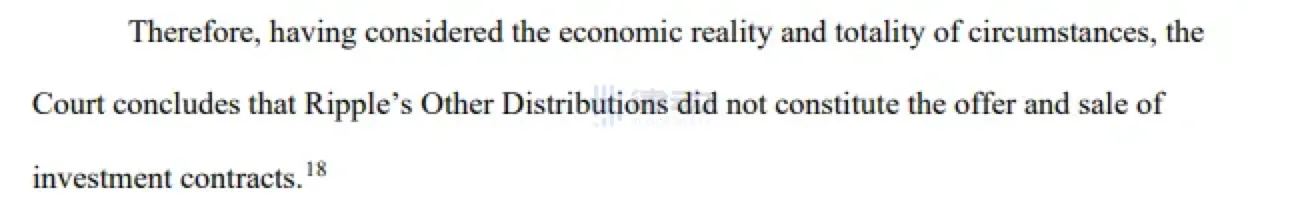 Ripple CEO Brad Garlinghouse 强调,该裁决最重要的部分是:XRP 是一种数字 Token,不是体现投资合同 Howey 要求的「合同、交易或计划」,现在这已经是一个不接受审判的法律问题了。