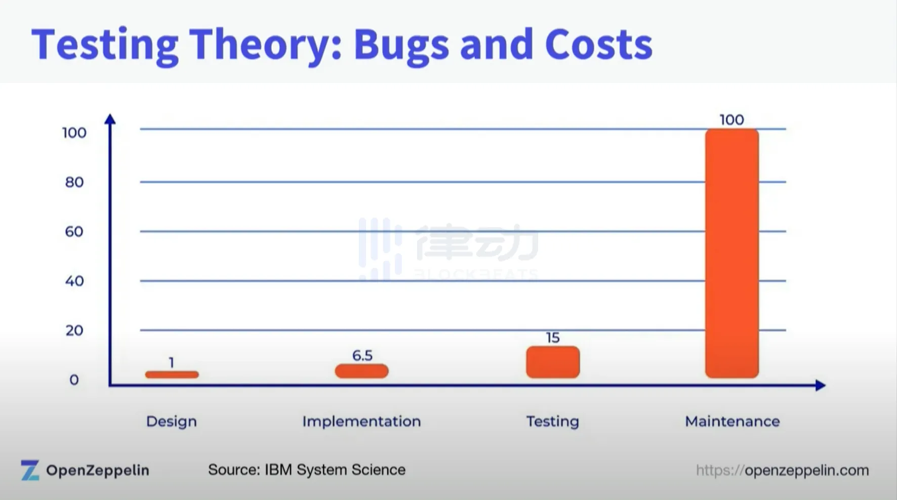 IBM 提供的理论数字表明我们应该大力投资于测试,因为这会带来实际回报。如果您在设计阶段、实现阶段或专门的测试阶段提前发现问题,成本相对较低。然而在部署阶段,成本可能会急剧升高。这并非只适用于区块链系统,在此情况下,您看到的「100」这个数字可能会因为协议所带的 TVL 进一步提升。