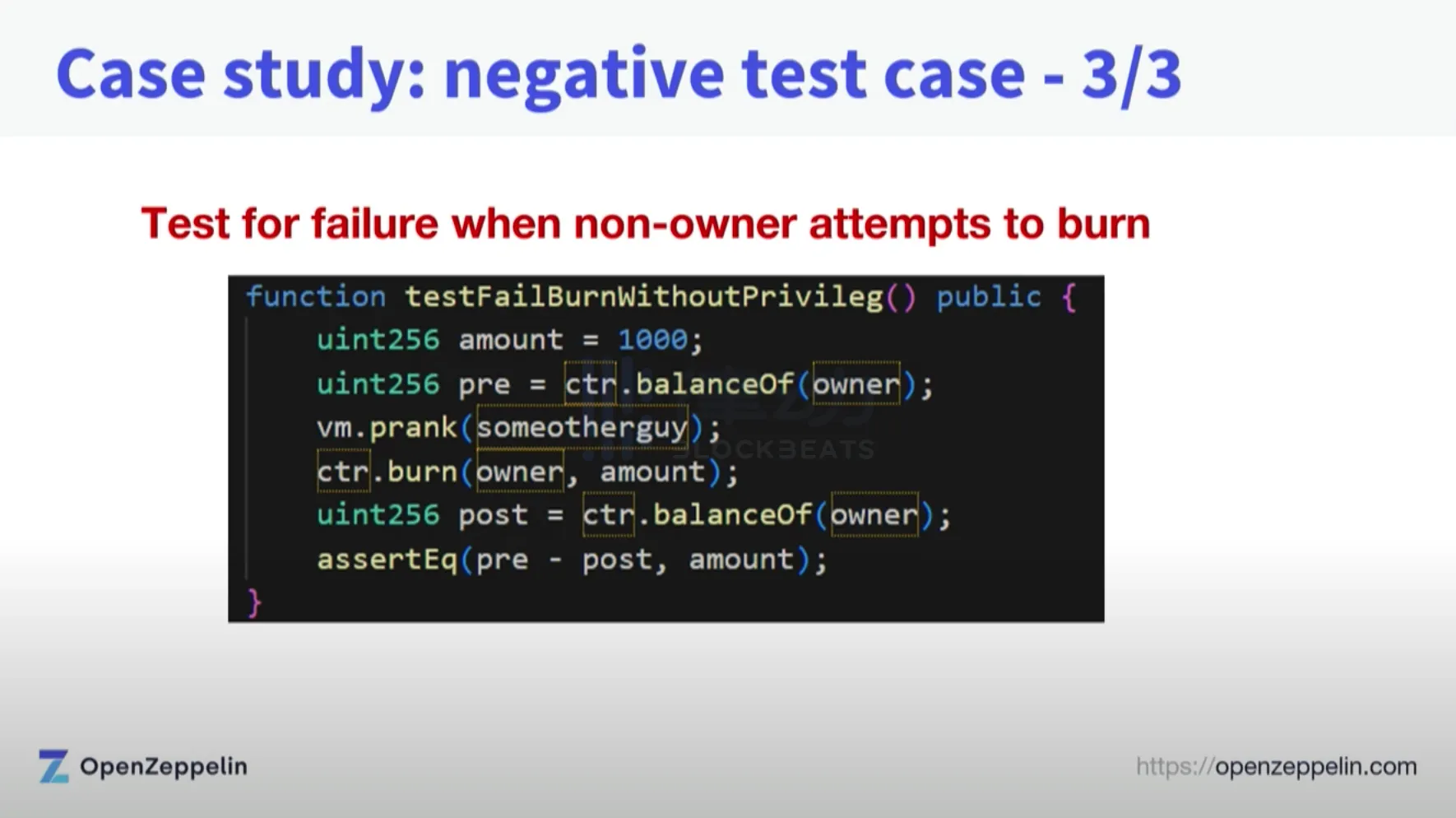 上面的这个测试用例是缺少的。在 Foundry 语法中,如果某个函数名以「test fail」开头,差不多意味着它用于检查特定的失败案例。典型的测试可能检查一个任意地址是否能够销毁另一个用户的 1000 枚代币。显然,您希望这样的情况不会发生,所以编写了这种负面测试。这只是一个简单的示例,让我们来看看总体原则。