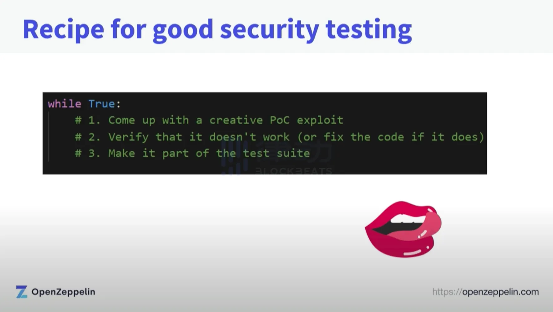 要做真正好的安全测试,我们需要从「while true」开始,因为您可以永远地迭代这个循环。您的目标是创造出一个全新的 POC 漏洞,尝试攻击您正在开发的协议。您也许会验证它不起作用,或者发现一些需要修复的东西。然后您可以把它作为一个测试用例集成到您的安全测试套件中。