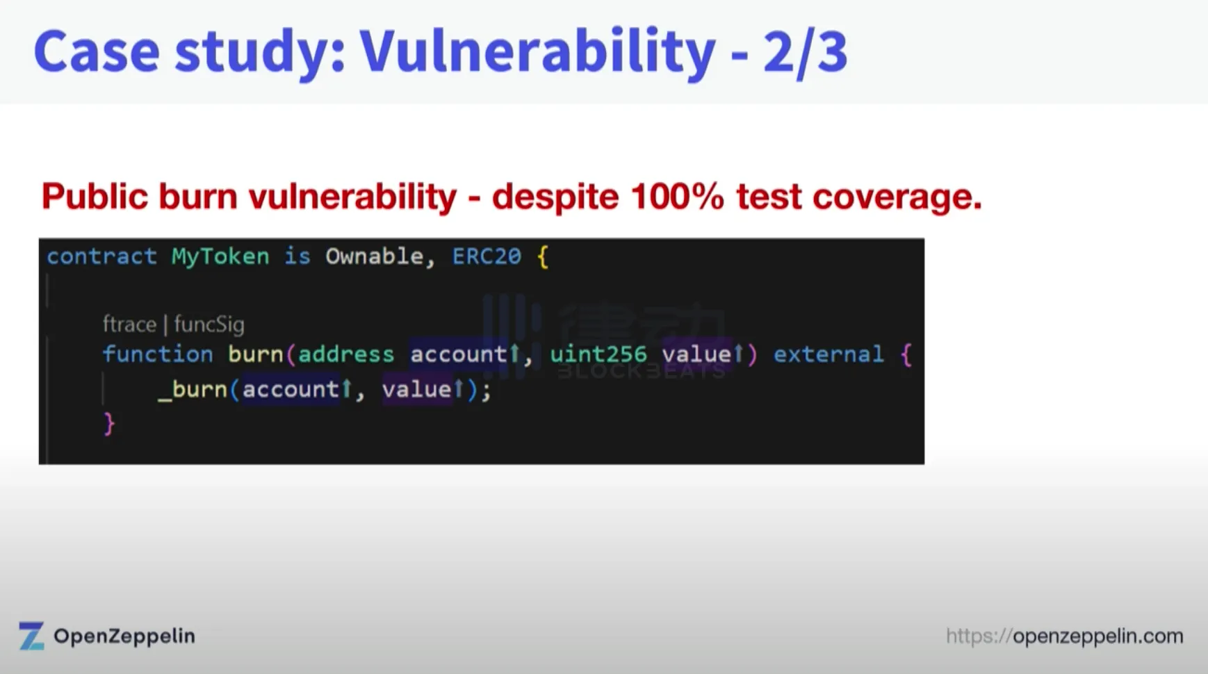 在幻灯片上半部分可以看到,100% 的测试覆盖率由 Foundry(Solidity 框架)保证。从幻灯片下半部分看到,这个代币有三个用例:铸造、销毁和转移。它们都能工作,并在这个测试用例中被覆盖。基本上我们在「功能性」和「描述性」方面做得很好,那么我们安全吗?