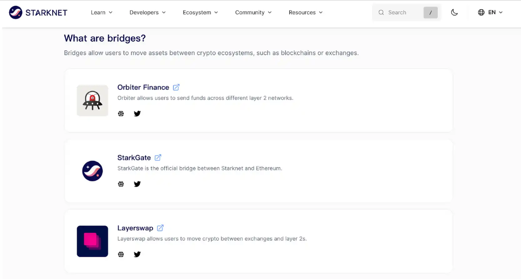 StarkNET 官网推荐了 Orbiter 跨链桥,而且是排名第一位的推荐。