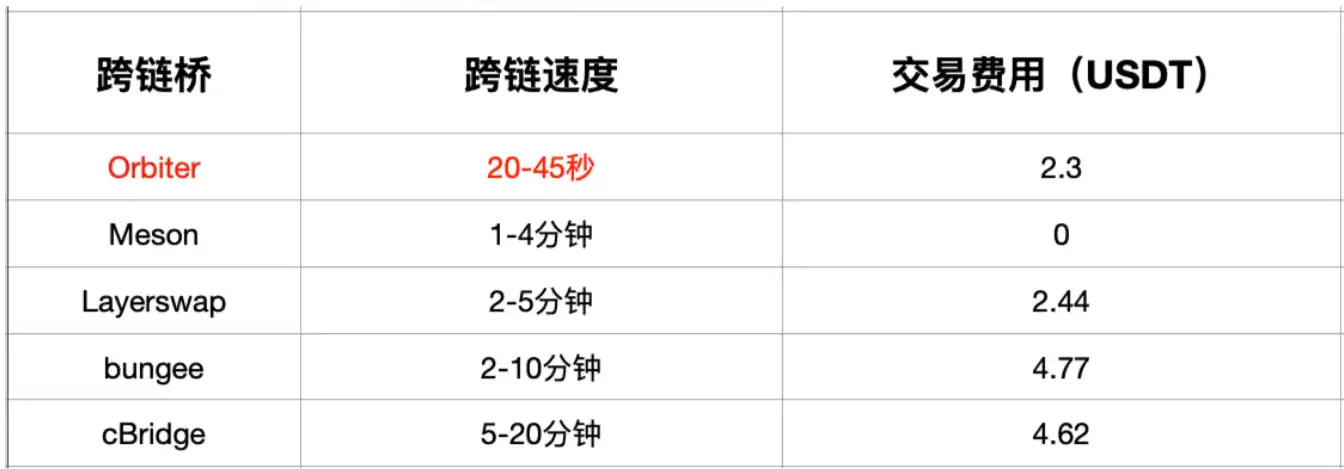 可以看到,Orbiter 的速度是最快的,基本上在 20–45 秒内就可以完成跨链,而排名第二的是 Meson 则需要 1–4 分钟的时间。