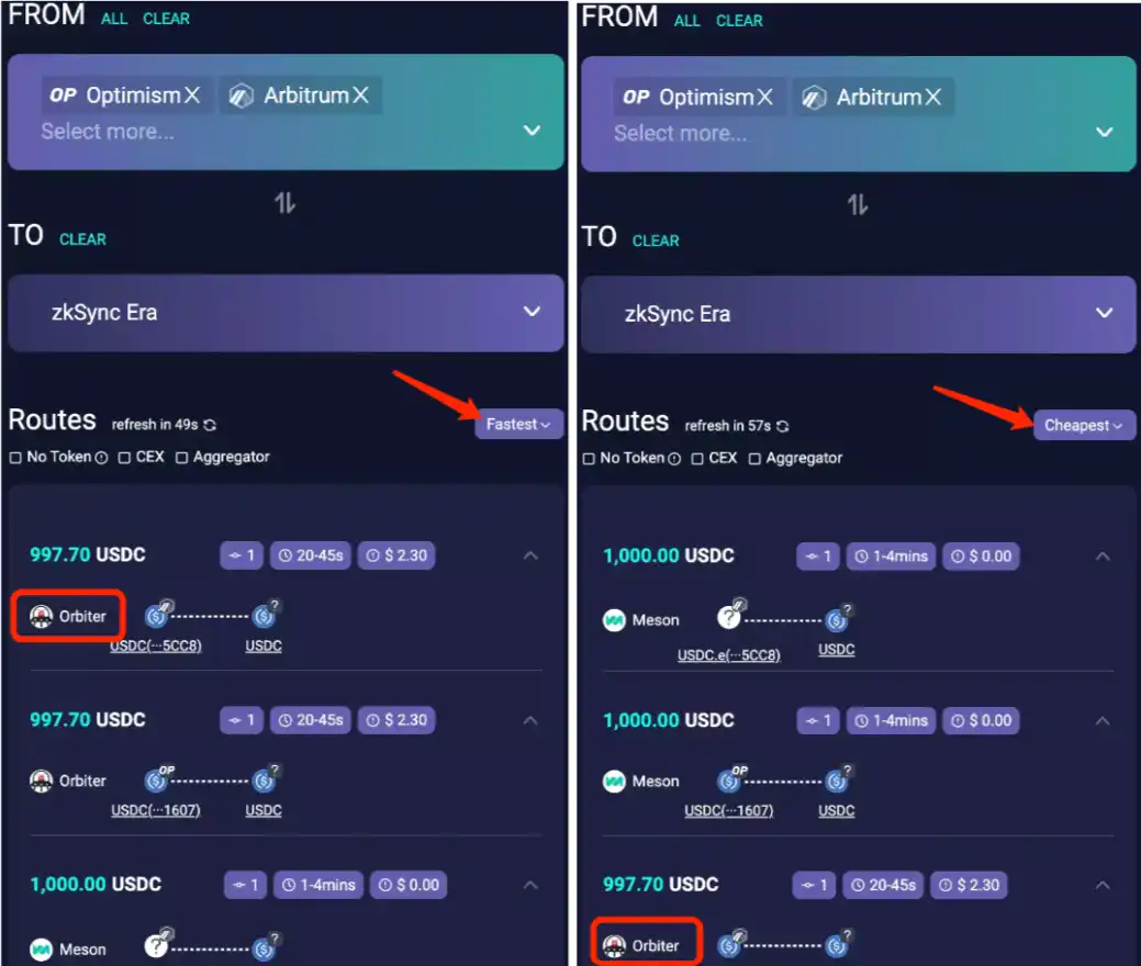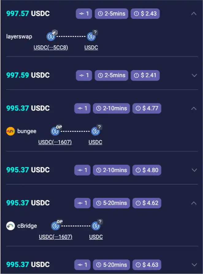 假如我们从 OP 链/ARB 链上转 1000USDC 到 ZK 链,看看这些跨链桥的费用以及速度: