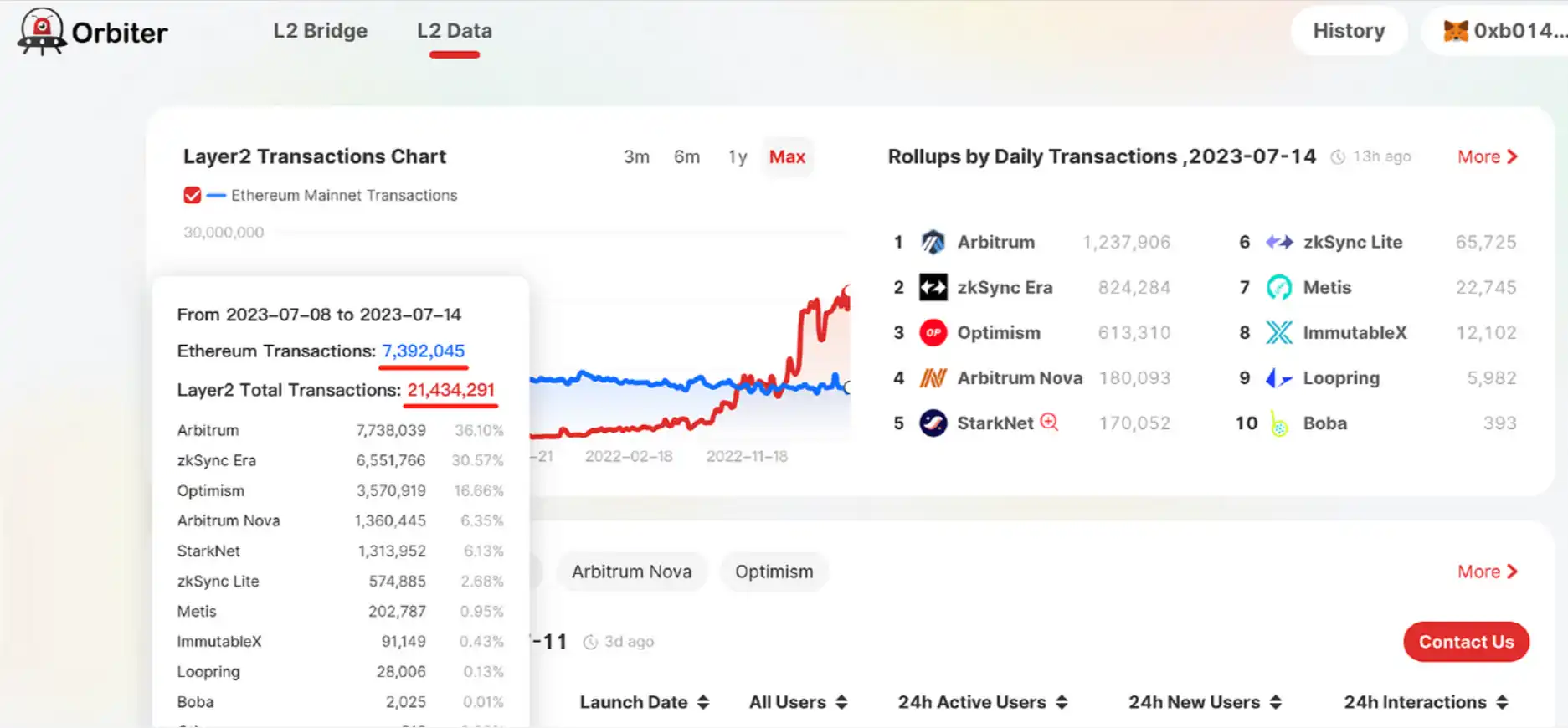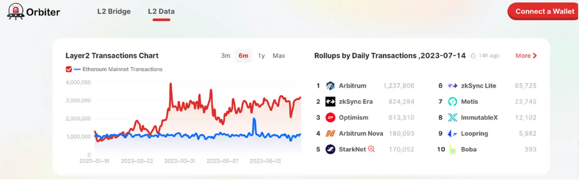 根据 Orbiter L2 Data(https://www.orbiter.finance/data)平台的数据统计,从去年年底以来,以太坊 L2 的总交易数(Transactions)开始超越以太坊主网的交易数。
