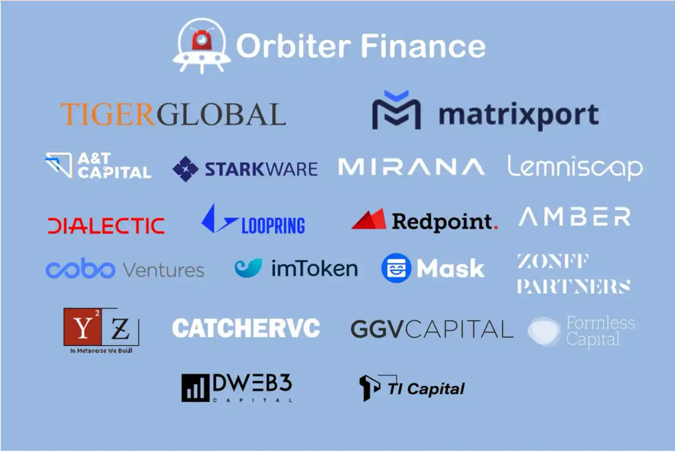 Orbiter 于 2022 年 11 月完成首轮融资,Tiger Global、Matrixport、A&T Capital、StarkWare、Cobo、imToken、Mask Network、Zonff Partners 等参投,但融资金额并未披露。