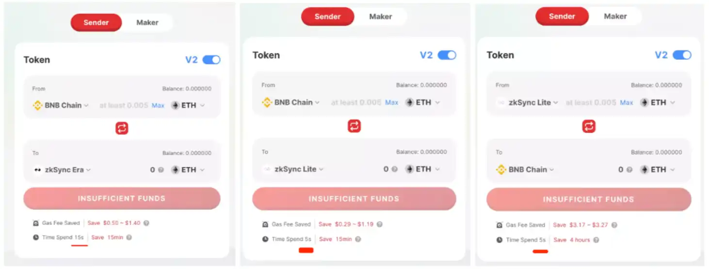 因为省去了不必要的合约交互,不需要一个专门的中间机构去铸造/销毁资产,Sender(资产兑换方)和 Maker(做市商,即承接跨链兑换需求方)之间直接进行转账。