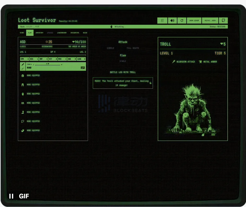 街机帐户的体验到底如何?Loot Realms 在轻量级小游戏 Loot Survivor 中展示了一个 Arcade 帐户为游戏玩家带来的直观感受——「流畅的游戏内交互体验,无需为每一次攻击操作签名」。