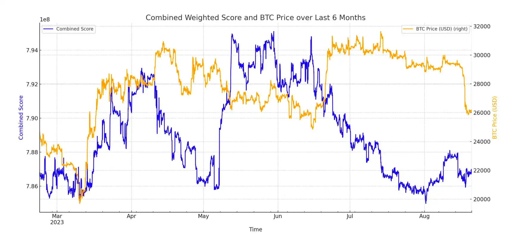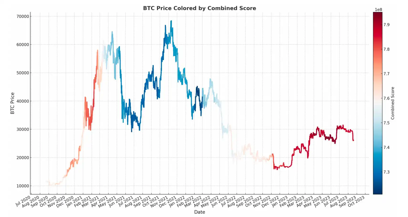 3. 在图表的某些点上,组合得分的变化率与 BTC 价格的⾛势似乎存在关联。例如,当 ROC 呈现深红⾊(表⽰迅速增加)时,BTC 价格可能也处于上涨趋势。相似地,当 ROC 为蓝⾊时,BTC 价格可能在下跌。但这种关联在整年内并不⼀直存在,这暗⽰BTC 价格还受到其他外部因素的影响。