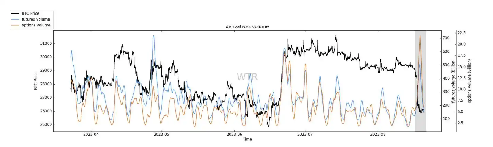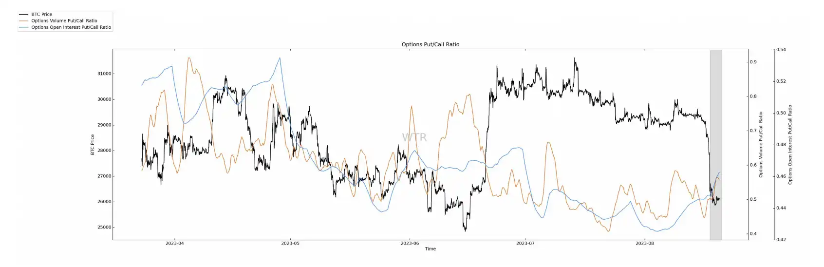 随着价格的下跌,期权的交易量以及看跌期权的⽐例也同时开始上升。