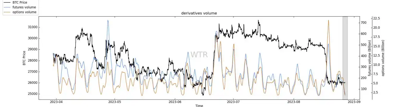 在市场短暂的下跌引起的⼤量衍⽣品成交后,当前衍⽣品成交量⼜回落⾄低位⽔平。说明衍⽣品交易者持观望状态较多。