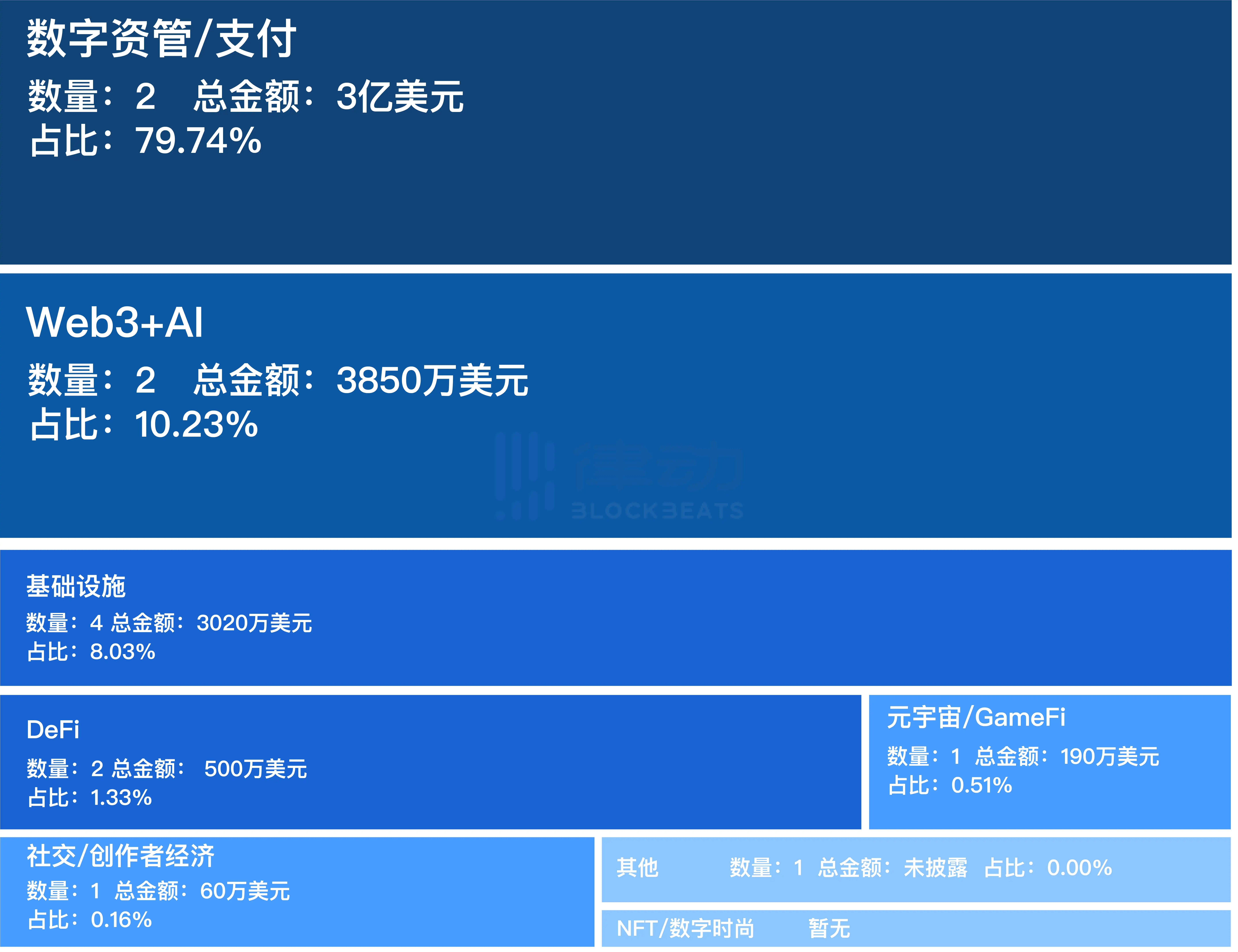 在数字资产管理/支付领域共计 2 笔融资,总金额超 3 亿美元,占上周融资总额的 79%。