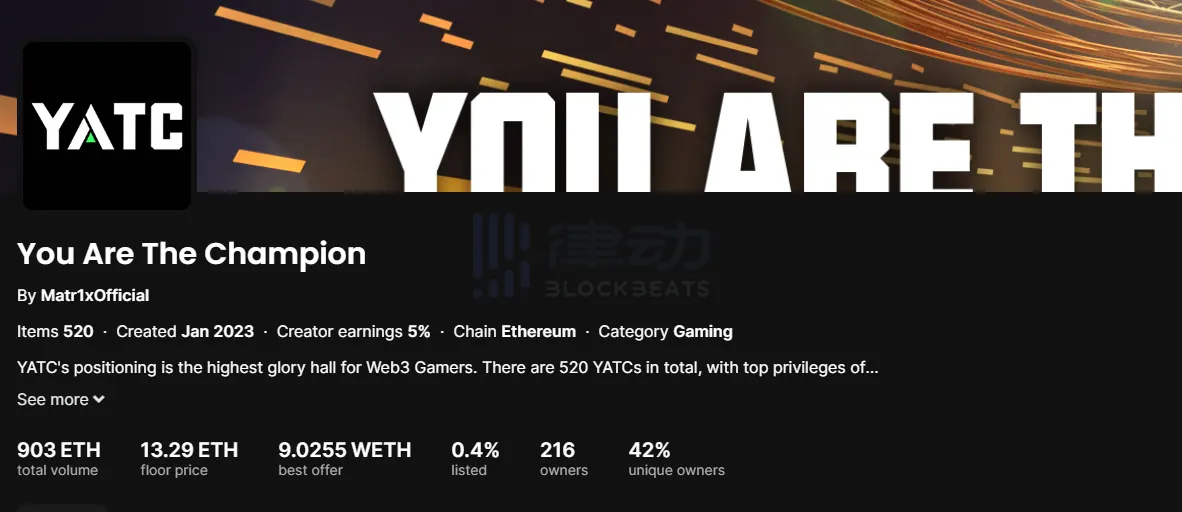 YATC 是冠军 NFT(You Are The Champion)的简称,总量 520 个,没有公开发售,目前 260 个 YATC 已免费空投给合作伙伴以及为 Matr1x 提供支持的个人,剩余的 YATC 将作为未来的游戏奖励分发。