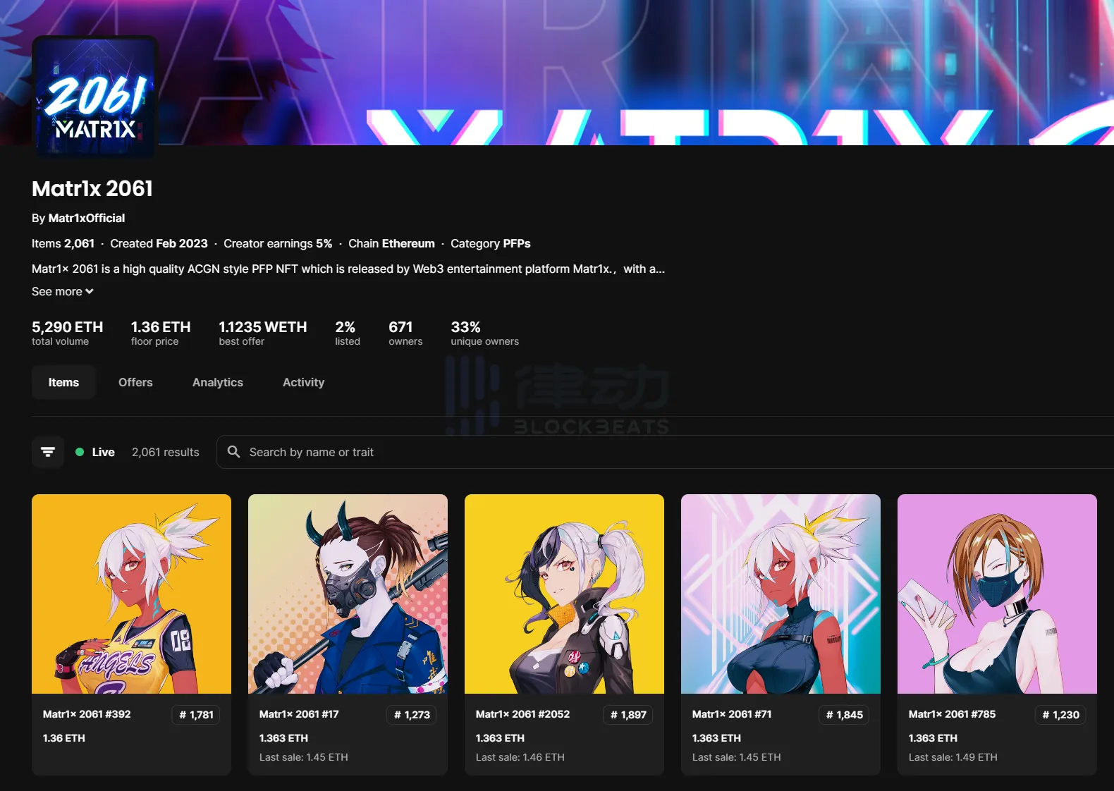 该 NFT 系列的发售价为 0.1 ETH,目前地板价为 1.36 ETH,已涨超十倍。在熊市中能有如此亮眼且稳定的市场表现,足可见市场对其价值的认可以及对 Matr1x 产品的信心。