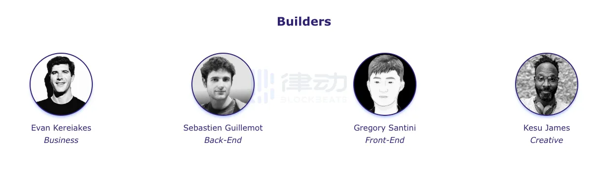 LuminaDEX 的团队成员包括:Evan Kereiakes、Sebastien Guillemot、Gregory Santin、Kesu James,分别负责商业、后端、前端、创意。