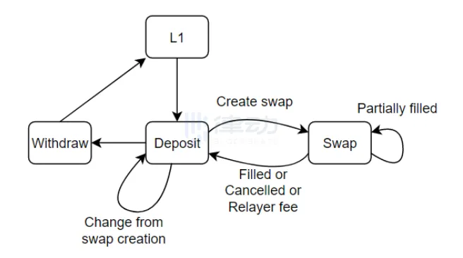 LuminaDEX 的功能包括将一个存款无需通过交换进行操作拆分为多个存款。这使得 DEX L2 的使用不仅限于交换,还可以作为账户转账的通用平台。同样适用于私人交换的 zkKYC 参数也适用于私人转账。所有这些 UTXO 都在两个默克尔树中进行跟踪,其根哈希存储在 L1 合约中。状态转换如下: