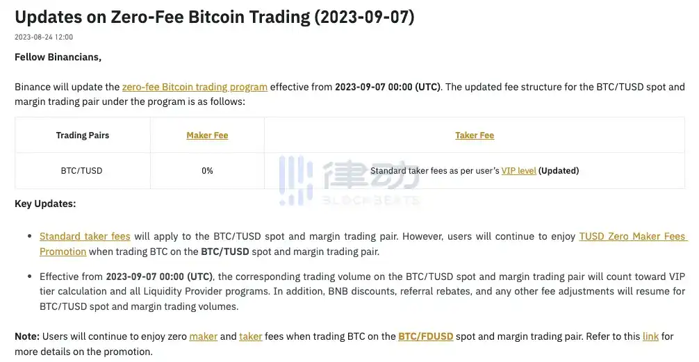 Binance 将于北京时间 2023 年 9 月 7 日 08:00 更新 BTC 零手续费交易计划。其中 BTC/TUSD 现货和杠杆交易对的吃单(Taker)手续费将根据用户对应 VIP 等级费率收取。同时,用户仍可以通过 TUSD 零挂单手续费活动享受 BTC/TUSD 现货和杠杆交易对的零挂单手续费优惠。