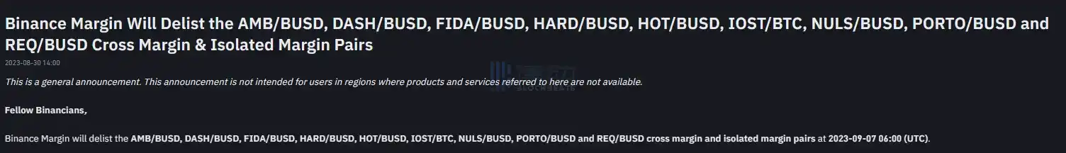 Binance 杠杆将于 9 月 7 日下架部分 BUSD、BTC 全仓杠杆以及逐仓杠杆交易对