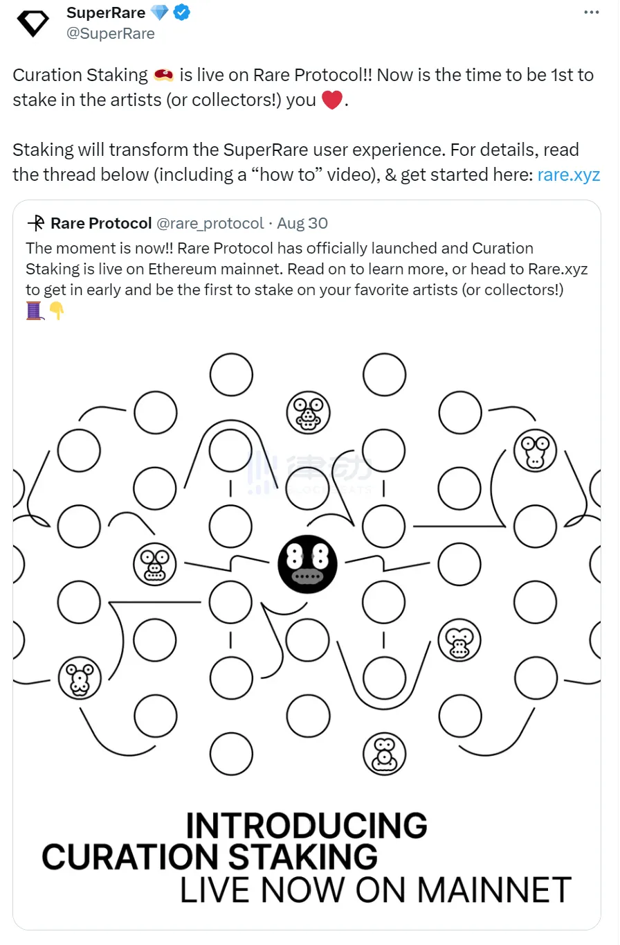 除了「艺术小网店」这种传统画廊线上化的策展方式,另一个 NFT 平台 SuperRare 在 8 月 30 日推出了一种 Token 激励实现策展效果的「策展质押 Curation Staking」。