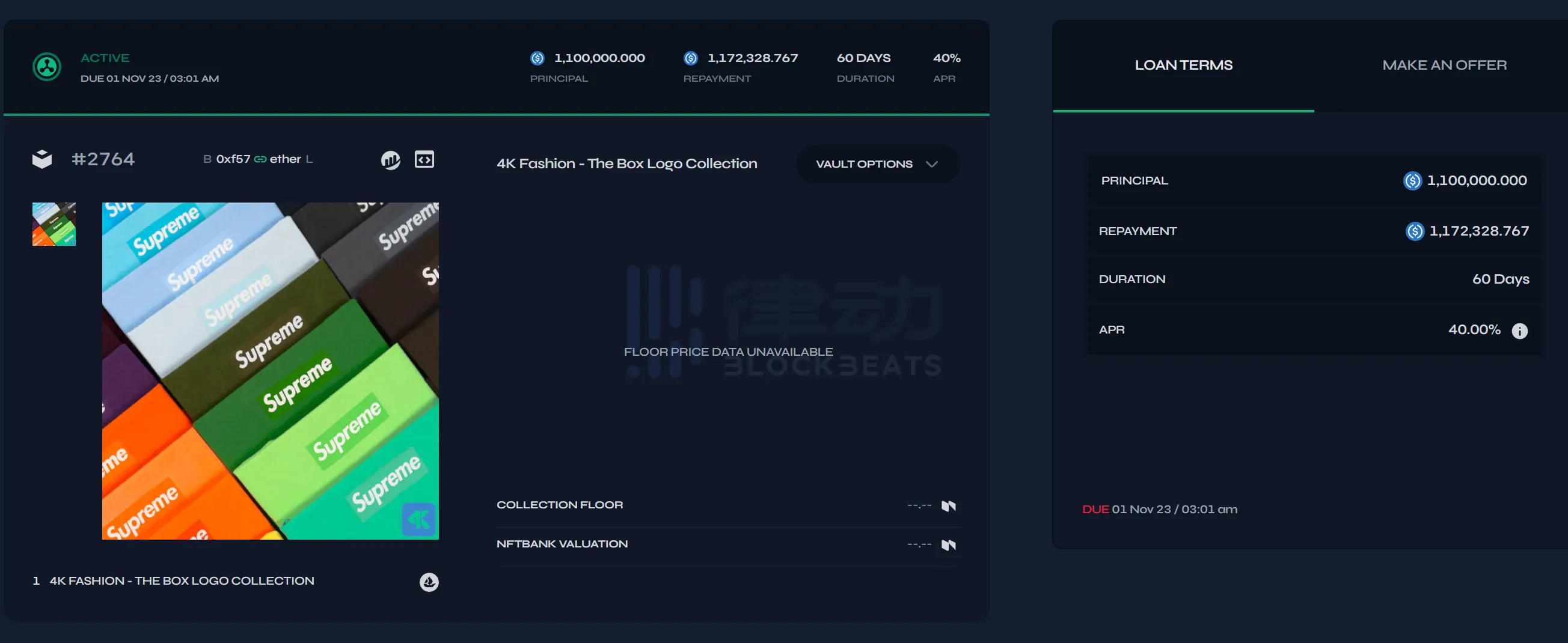 该笔借贷是通过 NFT 借贷平台 Arcade 完成的。拥有 1994 年 - 2022 年全套 Supreme Box Logo T 恤的收藏者将这些衣服发送给了 NFT RWA 协议 4K 进行托管,衣服的价值由佳士得进行评估后,4K 向借款人发送了代表全套 Supreme Box Logo T 恤所有权的 NFT,最后在 Arcade 上完成了借贷。该笔借贷的贷款人为 etherhound.eth,金额为 110 万美元,APY 为 40%,期限为 60 天。