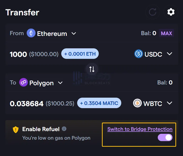 如果在目标链上没有足够的原生 Token 作为 gas 费,可以使用 Refuel 功能,将源链上桥接的少量 Token 交换为目标链的原生 Token。充当 gas 费的 Token 数额会在界面中显示出。