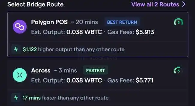 输入金额后,会显示出可以选择的路线,可以查看路线的成本和所需交易时间。选择合适的路线,就可以进行跨链资产转移了。