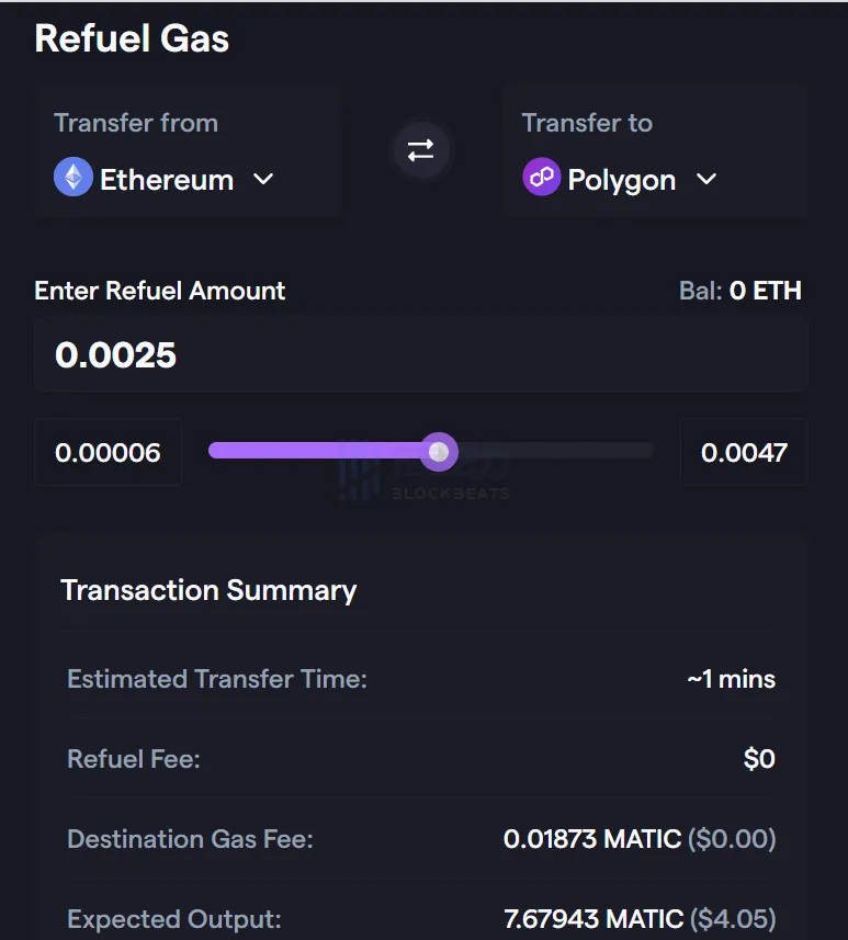 对于想要跨链移动少量原生 Token 的用户,Refuel 也可以作为独立的桥梁使用。选择源链和目标链后,Bungee 会在下面的滑块上突出显示 Refuel 的最小和最大限制。