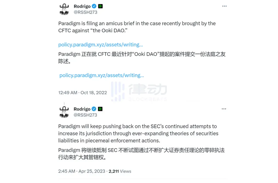 BlockBeats 曾报道,2022 年 10 月,Paradigm 提交法庭顾问简报声援 Ooki DAO。今年 4 月 25 日,Paradigm 法律负责人 Rodrigo 又表示,为避免 SEC 将稳定币定义为证券,已在 Terra 案中提交法庭之友简报。