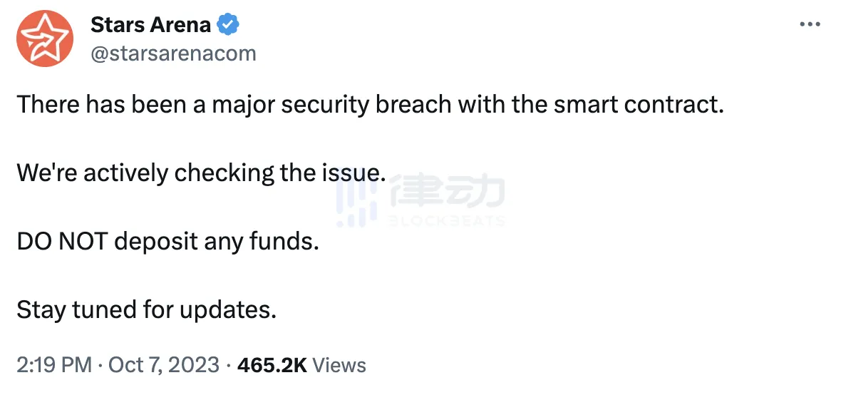 经历了两次被盗、被疑 rug 后,10 月 11 日,Stars Arena 发文称技术团队编写了全新的智能合约,正在与 Paladin Blockchain Security 完成全面的合约审计,审计完成后将开源。关于本次被盗后续的进展,BlockBeats 也将持续关注。