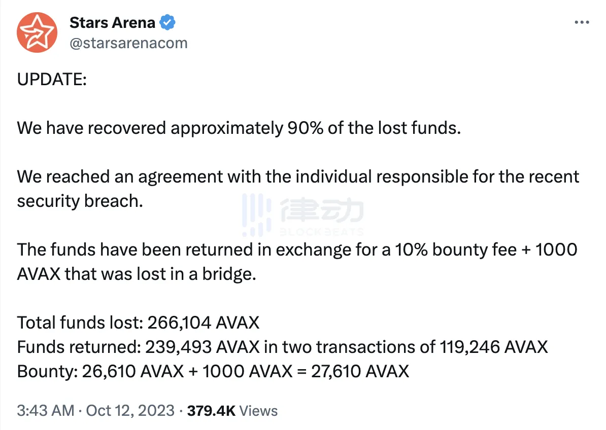 BlockBeats 此前消息,10 月 12 日,Stars Arena 在安全更新中表示,该团队已成功找回近乎 90% 的损失资金。据悉,此次安全事件是由一名个体所致,双方已达成协议。作为回报,Stars Arena 向此人支付了 10% 的赏金(26,610 AVAX)以及在跨链桥中丢失的 1000 AVAX,总计 27,610 AVAX。初步统计显示,Stars Arena 总共损失了 266,104 AVAX,已成功收回 239,493 AVAX。