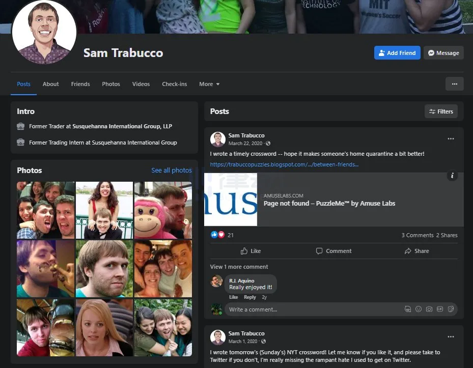 除此之外,Trabucco 还是个填字游戏构建爱好者,他一直是《纽约时报》填字游戏的构造者。据此前一期 FTX 播客的内容,截止 2020 年 Trabucco 在《纽约时报》所有填字游戏构造者排名中位列第八。