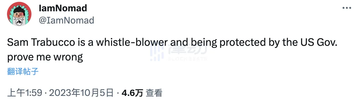 加密 KOL IamNomad(@IamNomad)在社交媒体表示:「Trabucco 是一名举报人,受到美国官方的保护。请证明我是错的。」