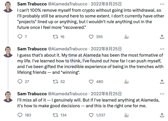 好景不长,三人聚首回归后没多久,2022 年 8 月 25 日,Trabucco 在社交媒体上发了一篇名为「happiness」的长推告别 Alameda。