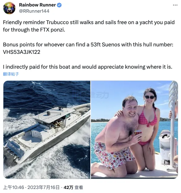 Rainbow Runner(@RRunner144)表示:「友情提醒,Trabucco 仍然可以在您通过 FTX 庞氏骗局付费的游艇上免费行走和航行。凡能找到一艘 53 英尺 Suenos 且船体编号为 VHS53A3JK122 的人即可获得奖励积分,我间接支付了这艘船的费用,并且很高兴知道它在哪里。」