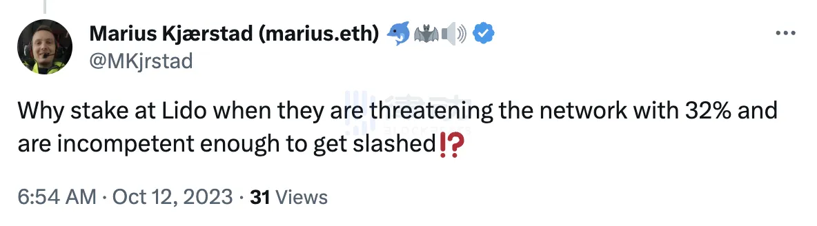 社区用户甚至评论道「当 Lido 以 32% 的份额威胁网络并且被 slashing 时的无能为力,为什么还要在 Lido 上进行质押?」