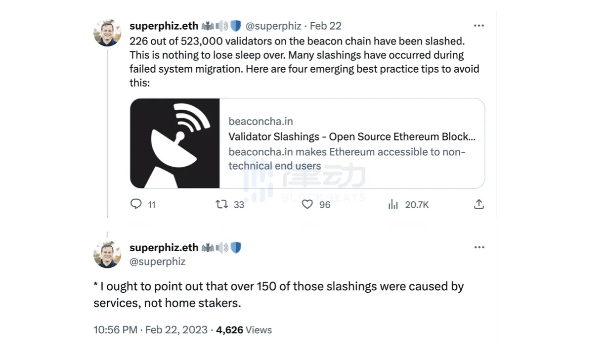 以太坊核心开发者 Superphiz 在今年 2 月曾在社交媒体上表示,自 2020 年 12 月 1 日推出信标链以来,以太坊生态系统仅削减了 226 个验证器,仅占 524,060 个验证器的 0.04%。而在 226 次 slashing 中,有超过 150 次是由「服务器」而非「单个抵质押者」造成的。