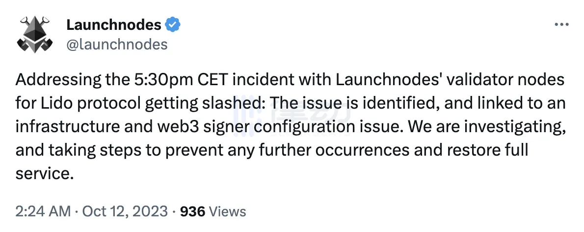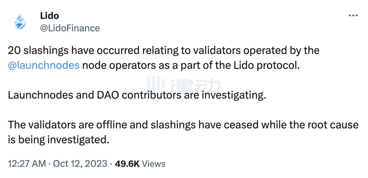 10 月 12 日,流动性质押平台 Lido Finance 官方披露,因为由 Launchnodes 运营的验证器出现的一系列基础设施和签名配置问题,Lido 协议发生了 20 次罚没(Slashing)事件。(注:罚没是指验证者因违反协议规则而受到惩罚,从而导致部分或全部抵押的 ETH 被扣除。)