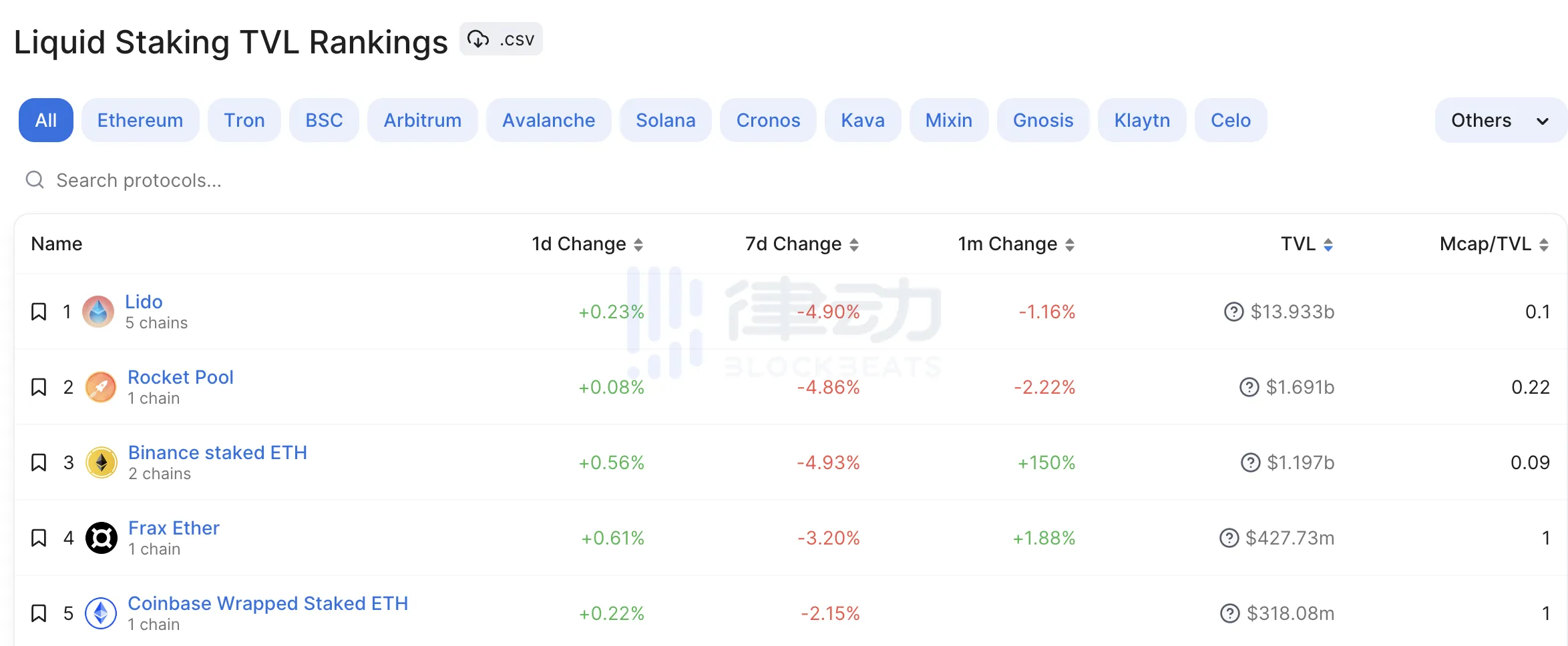 据 DefiLlama 数据,Lido 是迄今为止最大的流动性质押协议,其 TVL 达 139 亿美元,第二大的 Rocket Pool 仅有 16.9 亿美元。