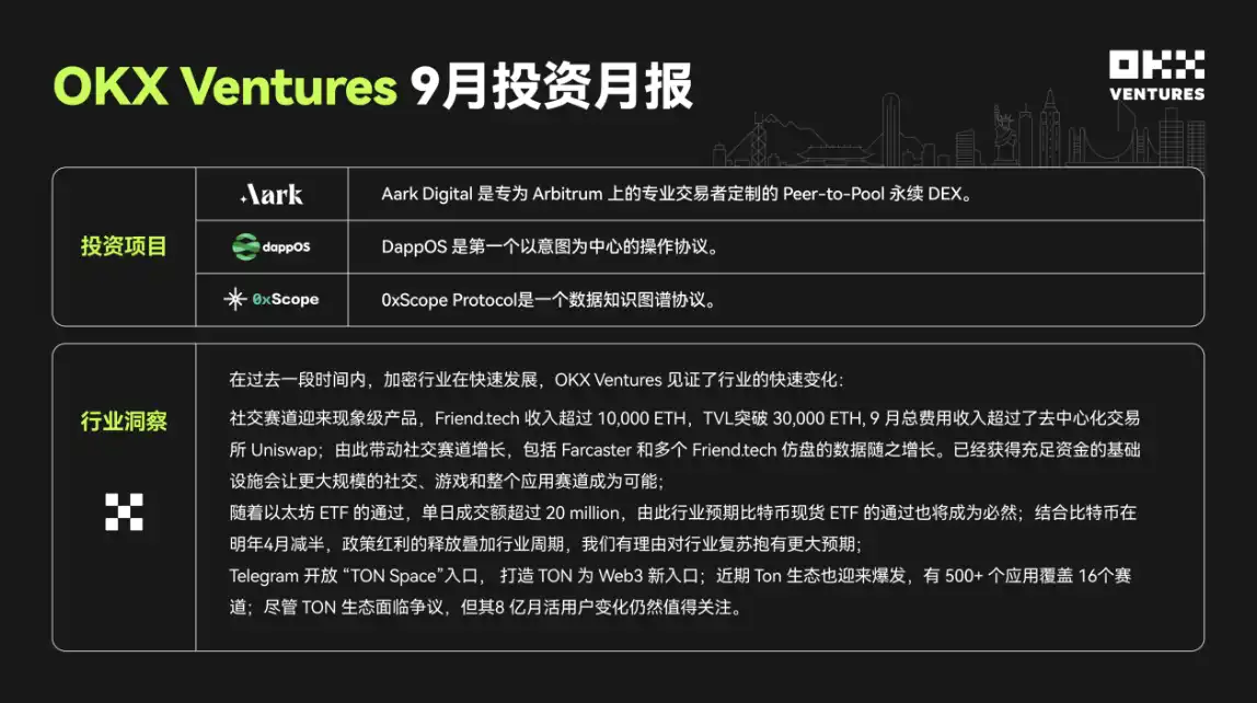 OKX Ventures 持续保持对行业的关注,持续看好基础设施、以太坊生态、DeFi 等赛道,出手投资了 Aark Digital 、 DappOS 和 0xScope 等项目。