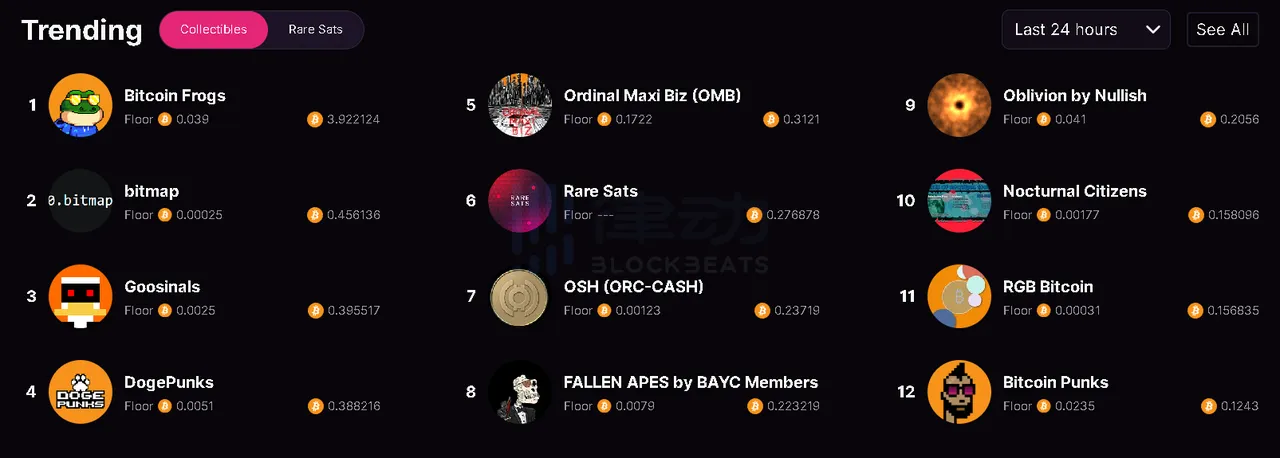 根据 Magic Eden 数据,Bitcoin Punks、DogePunks、Taproot Wizard 等都有明显涨幅:@Bitcoin_Punks_现报价 0.0235 BTC ;@PepesPixel 现报价 0.028 BTC;@DeGodsNFT 现报价 0.27 BTC;@BitcoinFrogs 现报价 0.039 BTC ;@ordinalmaxibiz 现报价 0.1722 BTC;@bitmapcommunity 现报价 0.00025 BTC。