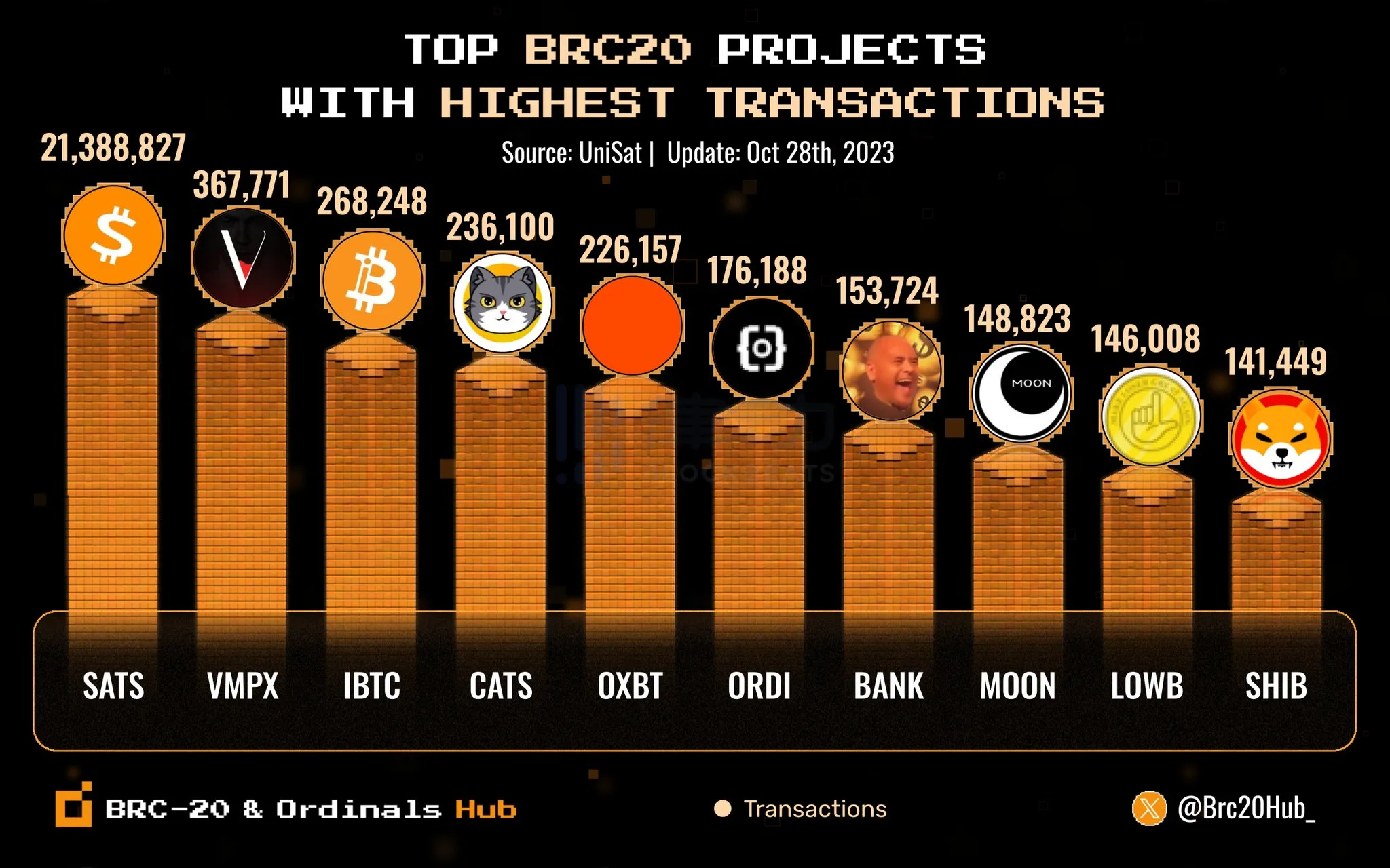 据 Tradingview 数据,BRC20 价格呈上升趋势,ordi 本月涨幅达到了 38.87%。目前,$SATS 交易量高达 21,388,827 笔,在打破交易量记录的 BRC20 项目中遥遥领先。截止 10 月 28 日数据,BRC20 最高交易额的项目排行榜如下: