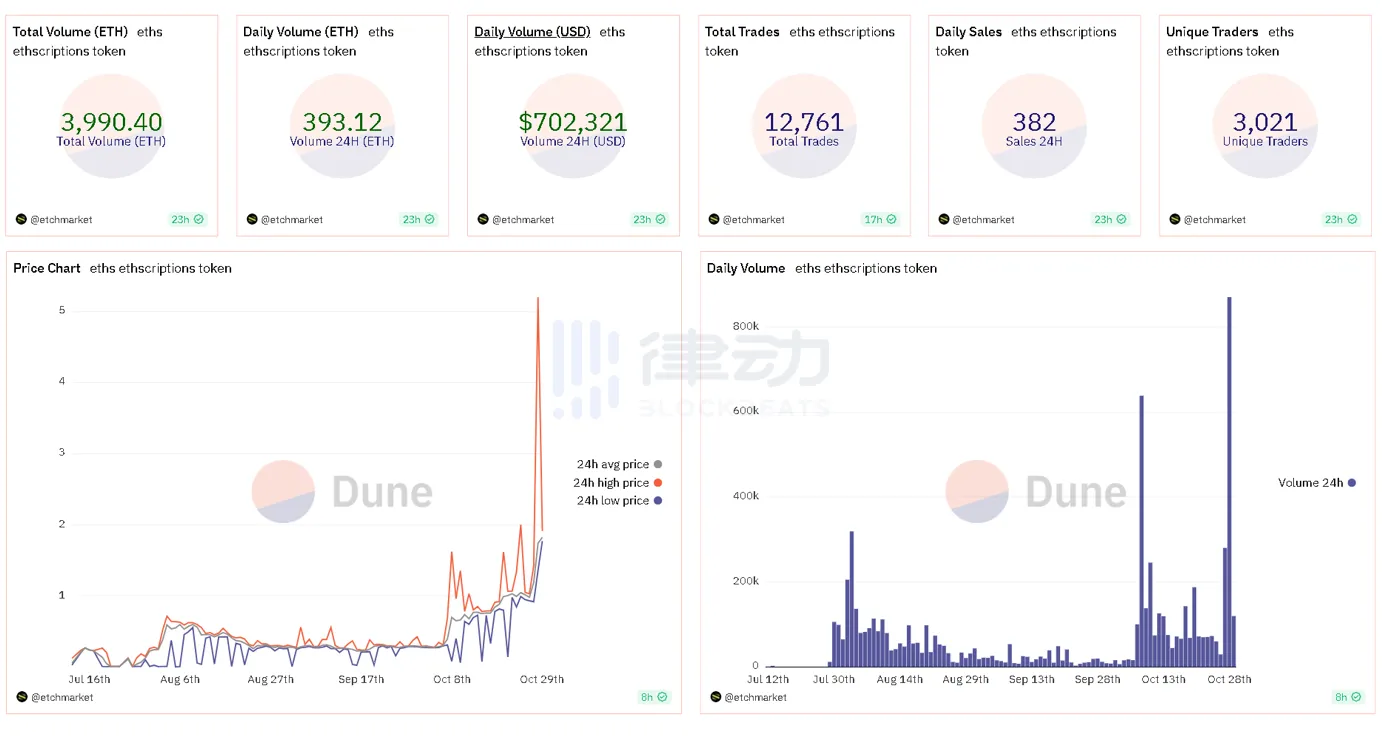 不止如此,以太坊铭文也算是半个比特币生态的项目了,与比特币生态不同,以太坊玩家若想炒铭文只有 ETHS 可选,这个模仿 BRC-20 Token 的 Ethscriptions 在半个月前被突然爆拉,于 10 月 8 日市值迎来一波高峰期,此后在经历短暂下跌后一路猛涨,截至撰稿时,市值高达 3800 万美元。