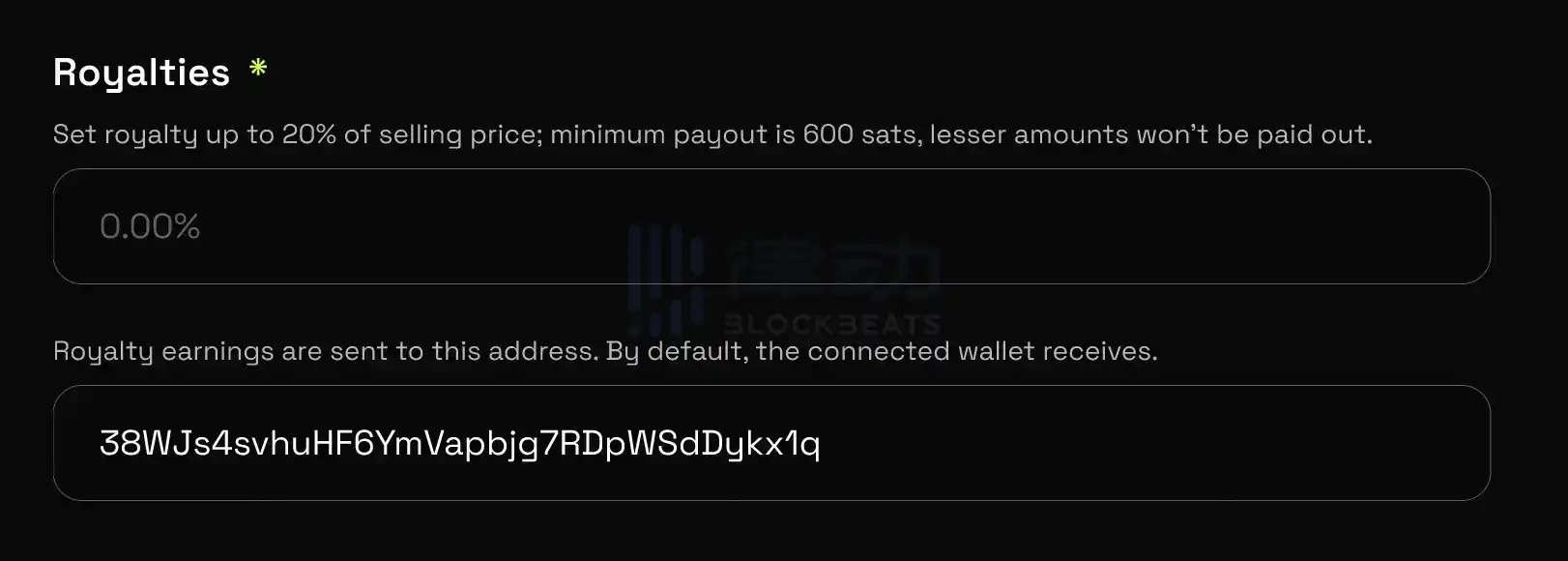 成功创建收藏后,会显示创建者设置的版税百分比。在列出铭文时,作者能够确定是否有与之相关的版税。如果铭文包含特许权使用费,它将显示在购买模式中,并且特许权使用费将计入价格计算中。