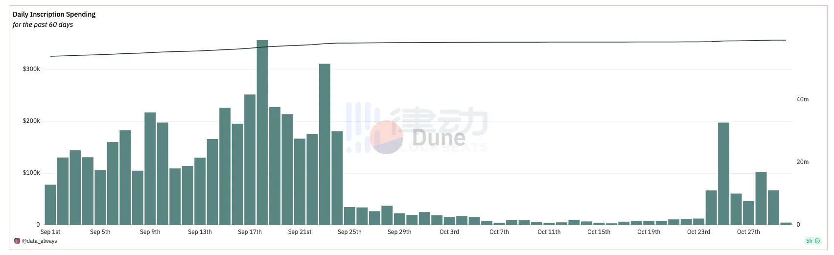 根据 Dune 过去 60 天比特币铭文每日支出的数据显示,本周的铭文支出明显有大幅增加。