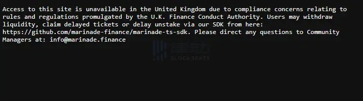 BlockBeats 此前报道,10 月 23 日,由于对英国监管机构 FCA 法规的「合规性担忧」,Solana 生态头部 DeFi 协议 Marinade Finance 阻止英国用户访问该网站。英国用户的登陆页面显示了一条警告信息,并指出「用户可以通过我们的 SDK 提取流动性、申领延迟票据或延迟解除质押」。此外,Solana 生态 DEX Orca Finance 也为英国用户增加了地理屏蔽功能。