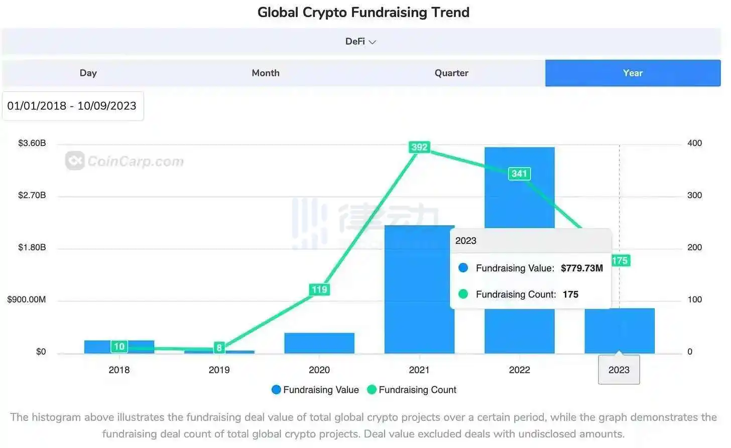 一个残酷的事实是,裁员是一家公司面临经营困难时最先做出的选择。尽管目前市场情绪回暖,但落到资金面来说,2023 年 DeFi 领域每轮融资的平均金额下降了 55% 以上。据 CoinCarp.com 数据,2023 年截止目前共有 175 轮 DeFi 融资,筹集了总计 7.79 亿美元,平均每轮 440 万美元。与去年 341 轮筹集总额 35.6 亿美元,平均每轮 1000 万美元相比,这是一个大幅下降。