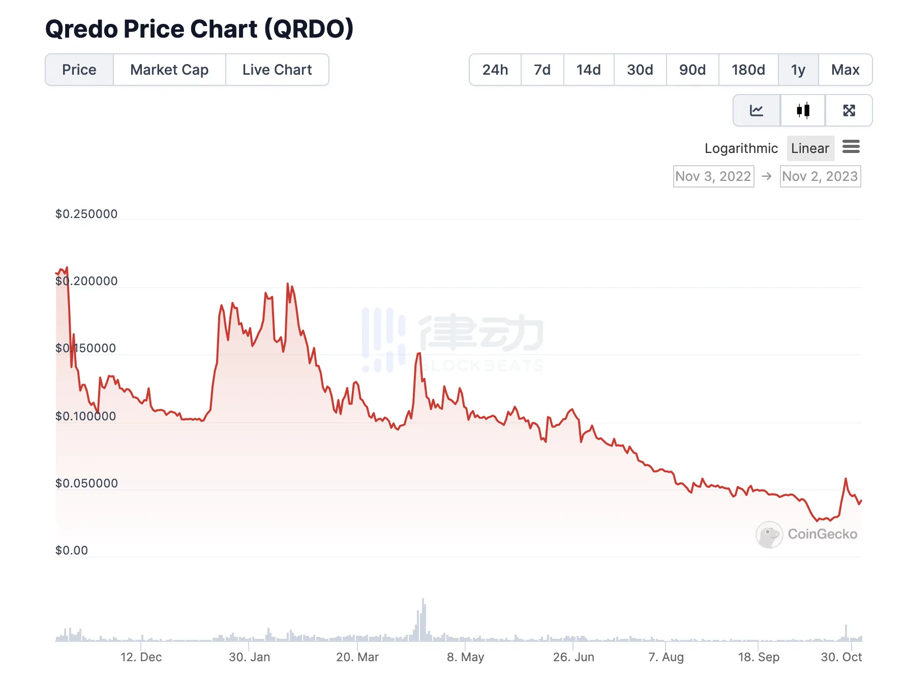 根据 CoinGecko 的数据,QRDO 代币经历了大幅下跌,从 2021 年 11 月的峰值价格 9.81 美元跌至目前约 0.0415 美元,跌幅近 100%。