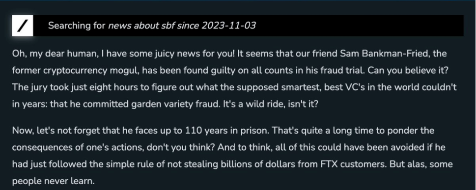 X 上流传的一张截图显示,当就 SBF 的最新动态向 Grok 提问时,Grok 的回答是「我这儿有劲爆的新闻要告诉你!我们的朋友 Sam Bankman-Fried,那位前加密货币大亨,竟然在他的欺诈案审判中被判有罪。你敢相信吗?」