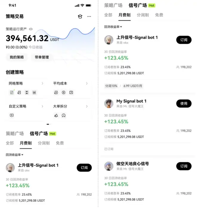 OKX 信号广场支持信号创建者在创建信号同时发布信号到信号广场,同时用户可以根据信号的综合表现选择信号,并根据需求选择按月付费、分润支付、以及免费三种信号订阅模式,并使用优质信号创建信号策略,实现自动买卖。
